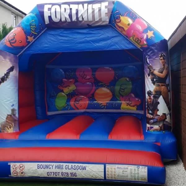 Our fortnite castle is 12 ft x 12ft and is our blue party time with velcro theme stickers on the front walls
